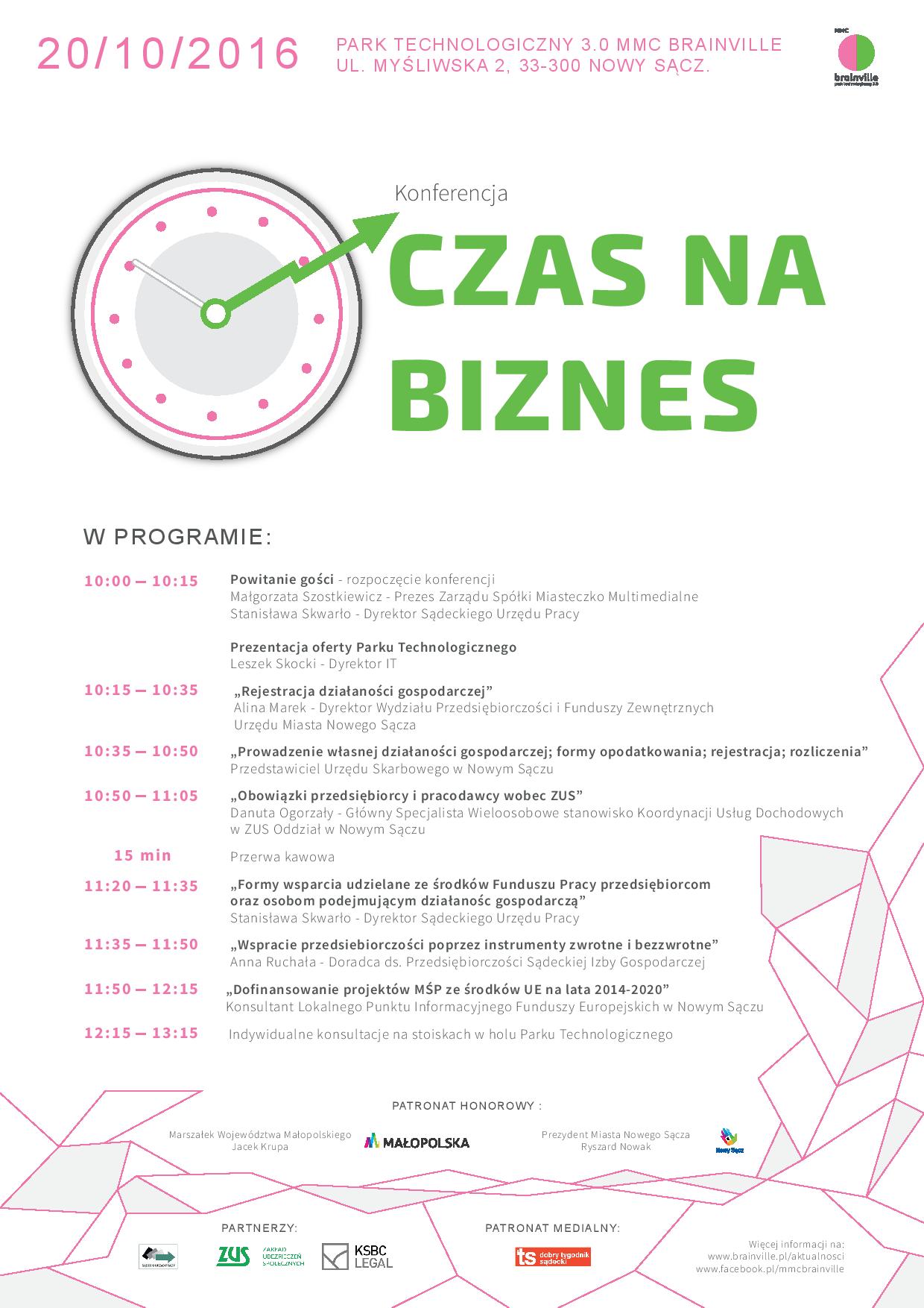 Konferencja „Czas na bizes” to wydarzenie organizowane przez MMC Brainville przy współpracy z Sądeckim Urzędem Pracy oraz z udziałem przedstawicieli Wydziału Przedsiębiorczości i Funduszy Zewnętrznych Urzędu Miasta Nowego Sącza, Zakładu Ubezpieczeń Społecznych, Urzędu Skarbowego, Sądeckiej Izby Gospodarczej oraz Lokalnego Punktu Informacyjnego Funduszy Europejskich.