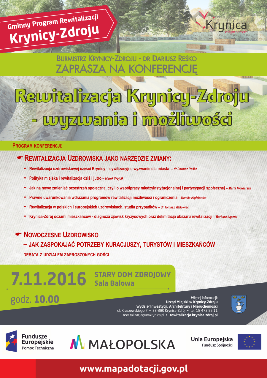 Serdecznie zapraszamy Państwa na Konferencję pt. „Rewitalizacja Krynicy-Zdroju - wyzwania i możliwości”, otwierającą proces tworzenia Gminnego Programu Rewitalizacji Krynicy-Zdroju na lata 2017-2023.