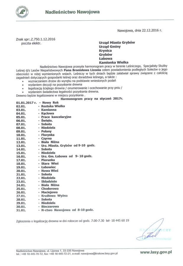 Nadleśnictwo Nawojowa przesyła harmonogram pracy w terenie Leśniczego, Specjalisty Służby Leśnej d/s Lasów Niepaństwowych Pana Bronisława Lizonia.