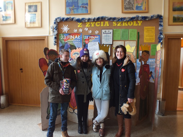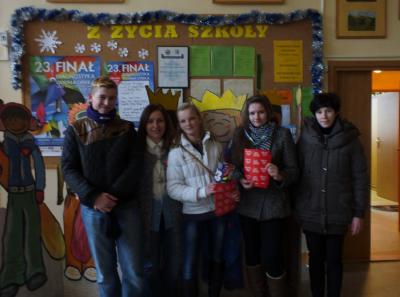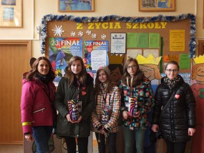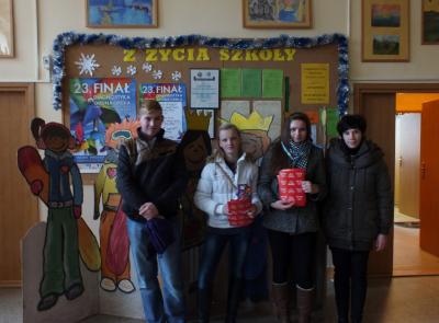 Tegoroczna akcja nie odniosłaby takiego sukcesu, gdyby nie zaangażowali się w nią ludzie gorących serc, czyli grono pedagogiczne, pracownicy administracji i emerytowani nauczyciele gimnazjum, no i oczywiście rzesza wolontariuszy. Szczególne podziękowania należą się darczyńcom: państwu Sekułom – Piekarnia Sekuła, państwu Bożenie i Krzysztofowi Maślankom, państwu Kiełbasom – hurtownia Asort, państwu Danucie i Krzysztofowi Machnikom.