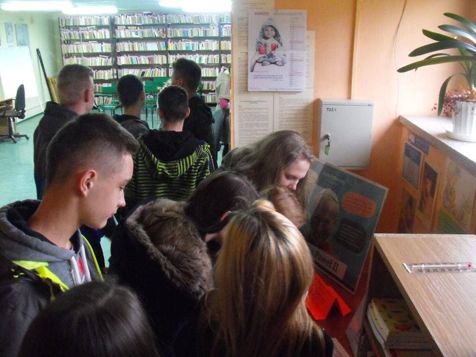 Dziewczęta działające w Aktywie Bibliotecznym wraz z opiekunem pokazały zasoby skomputeryzowanej biblioteki oraz czytelni multimedialnej, zachęcając gimnazjalistów do czytelnictwa; zaprezentowano akcje prowadzone przez bibliotekę szkolną oraz propozycje warsztatów dla młodzieży, np. biblioterapeutycznych.