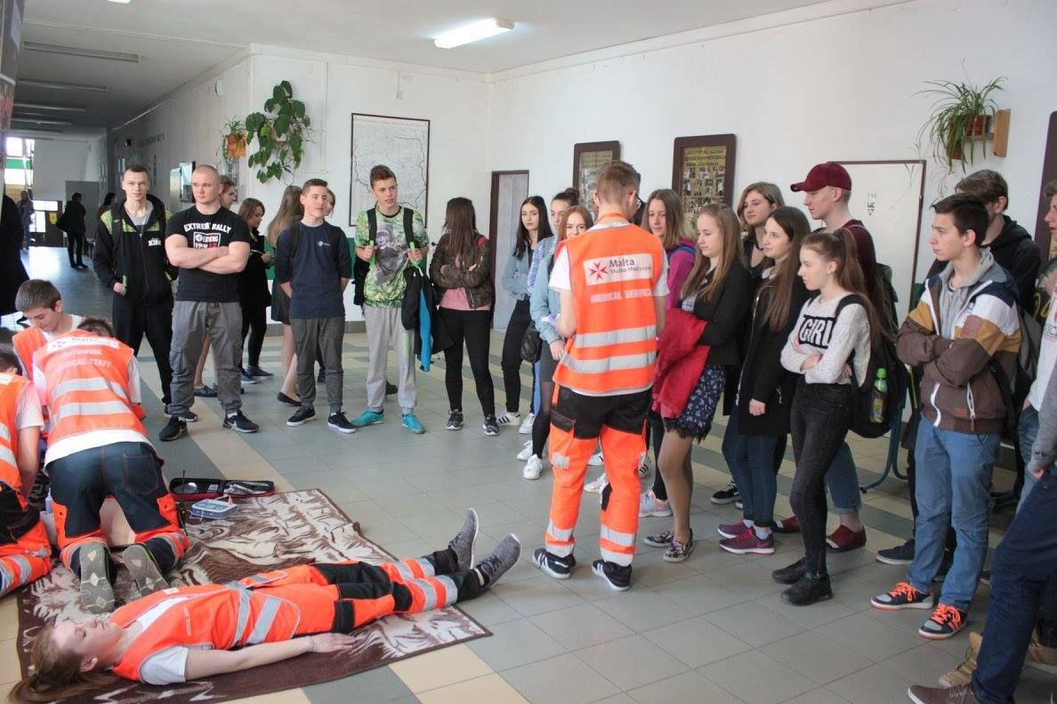Malta Służba Medyczna - oddział Krynica-Zdrój, w której aktywnie działają uczniowie szkoły, zorganizowała pokaz ratowniczy, w którym wolontariusze (uczniowie ZSP Krynica) pod kierunkiem ks. Andrzeja Farona, krok po kroku przedstawili schematy udzielania pierwszej pomocy.