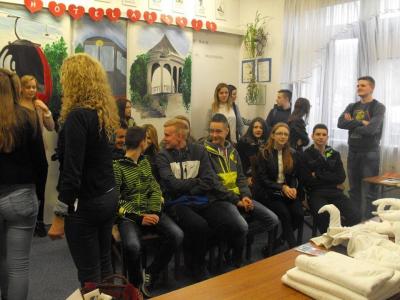Hotelarze zaprezentowali działalność na recepcji i w pokoju hotelowym. Odbył się specjalny pokaz układania ręczników, serwetek, wiązania krawatów oraz inne, takie jak barmański i baristyczny. Przedstawili gimnazjalistom programy komputerowe do nauki hotelarstwa, zachęcając do wstąpienia w progi elitarnej „Szkoły Mistrzów”.