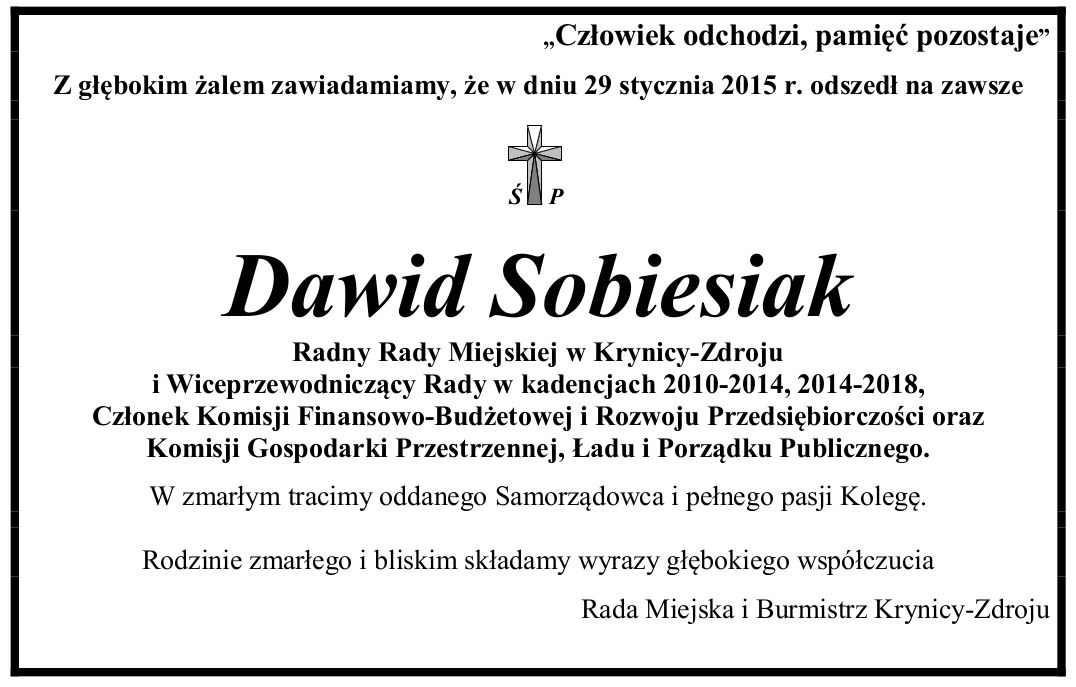 Zmarł Dawid Sobiesiak Wiceprzewodniczący Rady Miejskiej 30.01.2015 8:08 Treść Facebook Twitter Email Drukuj