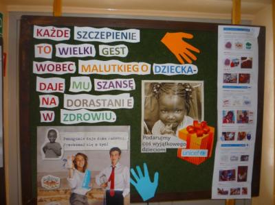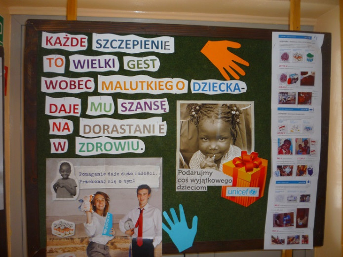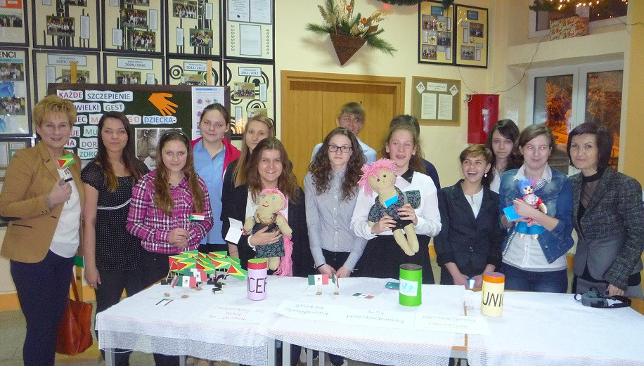 Projekt UNICEF był realizowany w naszym gimnazjum już po raz trzeci. Zawsze cieszy się ogromnym zainteresowaniem uczniów, a wcale nie ogranicza się tylko do eventu charyta-tywnego. Od listopada młodzież poznawała problemy Biednego Południa oraz działalność UNICEF metodą e-learningu. Kolejnym etapem było samodzielne przygotowanie scenariusza lekcji o Sudanie Południowym, znaczeniu szczepień w tym kraju z wykorzystaniem materiałów audiowizualnych. Uczestnicy projektu przeprowadzili na tej podstawie zajęcia w każdej klasie.-Projekt miał na celu nie tylko uwrażliwienie na potrzeby innych, kształtowanie tolerancji- podsumowuje Joanna Bykowska, szkolny koordynator akcji- Bardzo cenne okazało się rozwijanie w uczniach postaw otwartości, zaangażowania i kreatywnego rozwiązywania problemów. Niewątpliwą zaletą tego projektu była również współpraca międzypokoleniowa, gdyż w szyciu laleczek pomagali rodzice i dziadkowie.
