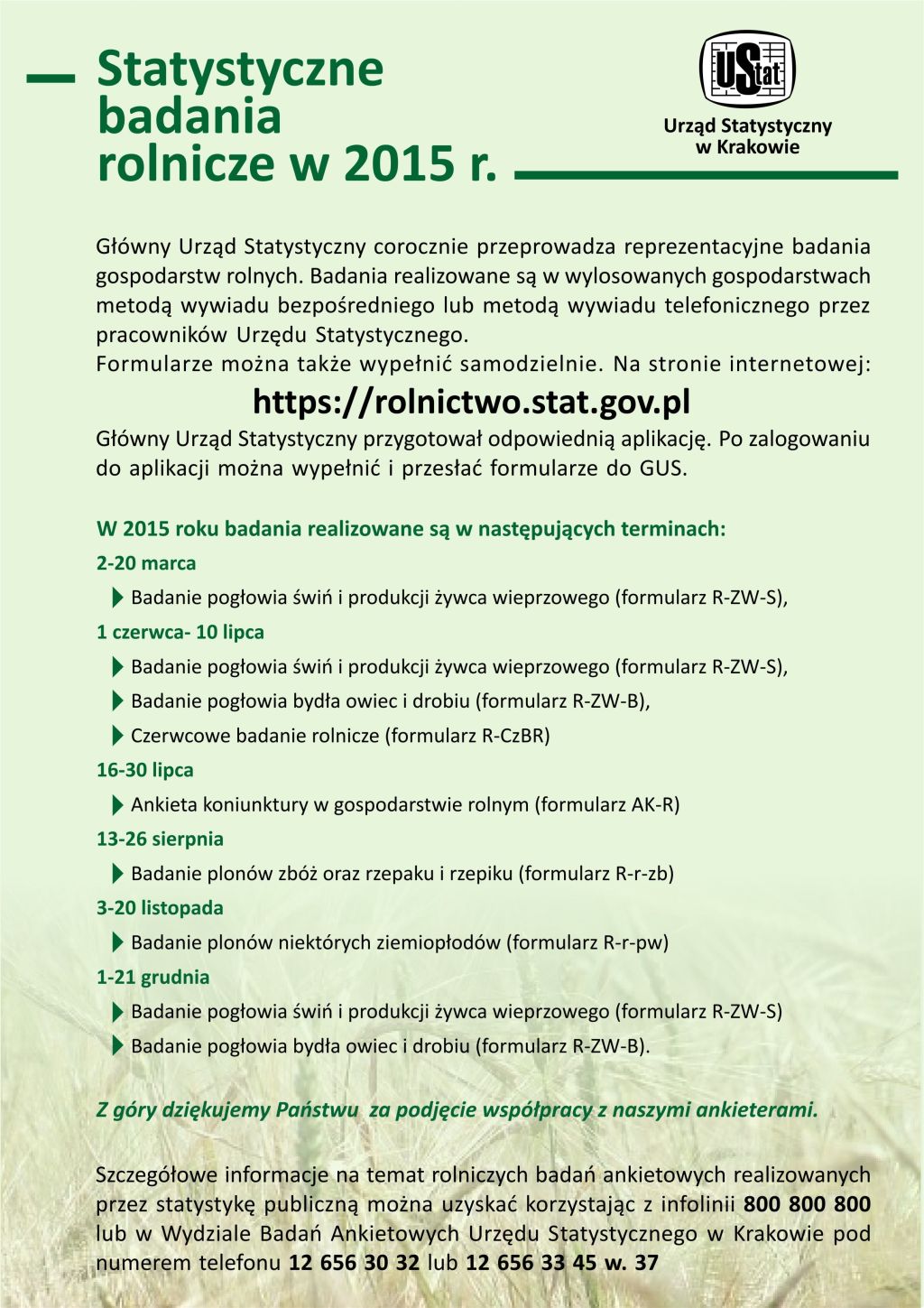 W roku 2015 Główny Urząd Statystyczny będzie przeprowadzał statystyczne badania rolnicze oraz badania ankietowe. Szczegółowe informacje znajdą Państwo w załącznikach.