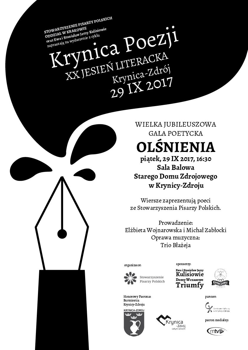 Krynica Poezji – słowno-muzyczna gala poetycka krakowskich poetów odbędzie się 29.09.2017 o godz. 16.30 w Starym Domu Zdrojowym (Sala Balowa). Na ten wieczór objęty patronatem burmistrza Krynicy-Zdroju zaprasza krakowski oddział Stowarzyszenia Pisarzy Polskich, kontynuacji dawnego, założonego w 1920 roku Związku Literatów Polskich. Członkami krakowskiego oddziału SPP byli m.in. nobliści Wisława Szymborska i Czesław Miłosz, a także byli i są nadal najwybitniejsi polscy twórcy literatury. Piątkowa gala będzie jubileuszowa: dwudziesta.