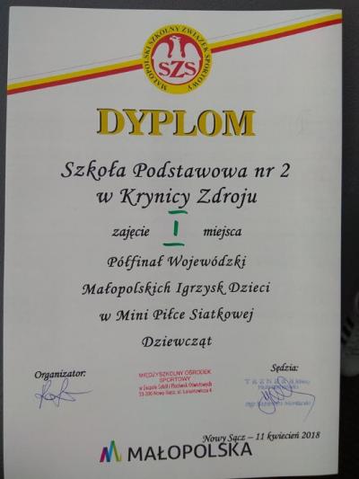 Awans do zawodów wojewódzkich uzyskała szkoła- Szkoła Podstawowa nr 2 w Krynicy-Zdroju w składzie: Bochniarz Wiktoria, Brzęk Natalia, Chrzanowska Gabriela, Kożuch Kaja, Nosal Emilia, Nosal Natalia, Ryba Julia, Siwiec Julia, Wolak Oliwia, Szyszka Monika