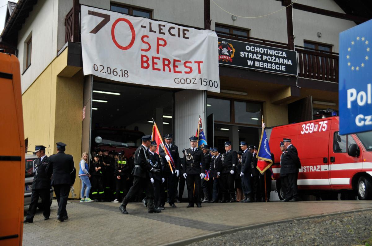 2 czerwca 2018 r. o godzinie 15.00 uroczystą mszą św. w kościele parafialnym rozpoczął się Jubileusz 70-lecia OSP Berest. Po mszy św. Kompanie Honorowe, Poczty Sztandarowe, zaproszeni goście wraz z Orkiestrą Dętą z Florynki przemaszerowali na stadion sportowy, gdzie odbył się uroczysty Apel. Wręczone zostały tam odznaczenia za zasługi dla pożarnictwa, będące formą podziękowań za działalność społeczną wykonywaną przez strażaków ochotników. W związku z Jubileuszem Prezydium Zarządu Oddziału Gminnego ZOSP RP w Krynicy-Zdroju nadało odznaki dla druhów, którzy najdłużej służą w OSP. Wśród nich znalazł sie druh Adam Gruca, który z jednostką OSP Berest jest związany od 68 lat, był wśród jej założycieli. Ponadto wysługę 50 lat otrzymali druh Jan Krok, Antoni Tarasek, Teodor Wincenciak, wysługę 45 lat druh Władysław Czernecki, Andrzej Nowak, wysługę 30 lat Kazimierz Czernecki. Licznie zgromadzona na uroczystości młodzież wchodząca w struktury Młodzieżowej Drużyny Pożarniczej OSP Berest złożyła ślubowanie, które odebrał st. bryg. Paweł Motyka Z-ca Komendanta Miejskiego PSP w Nowym Sączu, który również dokonał ceremonii pasowania młodych druhów. Starosta Nowosądecki Pan Marek Pławiak z okazji uroczystości 70-lecia OSP Berest w podziękowaniu za ofiarna ochotniczą służbę i działania na rzecz podnoszenia poziomu bezpieczeństwa na Sądecczyźnie postanowił wyróżnić „Złotym Jabłkiem Sądeckim” druha Jana Kroka i druha Antoniego Taraska, „Srebrnym Jabłkiem Sądeckim” druha Eugeniusza Jareckiego i druhnę Bożenę Warcholak-Zysek. Na zakończenie części oficjalnej Burmistrz Krynicy-Zdroju dr Dariusz Reśko przygotował niebagatelny prezent w postaci przekazania na rzecz OSP Berest kwoty 100 000 zł jako dofinansowanie do zakupu wozu strażackiego dla jednostki. Na tą okoliczność Burmistrz Krynicy-Zdroju Dariusz Reśko i Prezes OSP Berest druh Andrzej Nowak podpisali oficjalnie umowę związaną z przyjęciem ww. dotacji. Po zakończeniu oficjalnej części uroczystości zgromadzeni goście, strażacy, mieszkańcy uczestniczyli w pikniku strażackim, gdzie zaproponowano różne atrakcje m.in. poczęstunek, zawody strażackie, plenerową projekcję filmu z obchodów Jubileuszu 50-lecia utworzenia OSP w Bereście, pokaz ogni sztucznych, zabawę przy muzyce oraz rozdano uczestnikom okolicznościową broszurę przygotowaną z tej okazji.