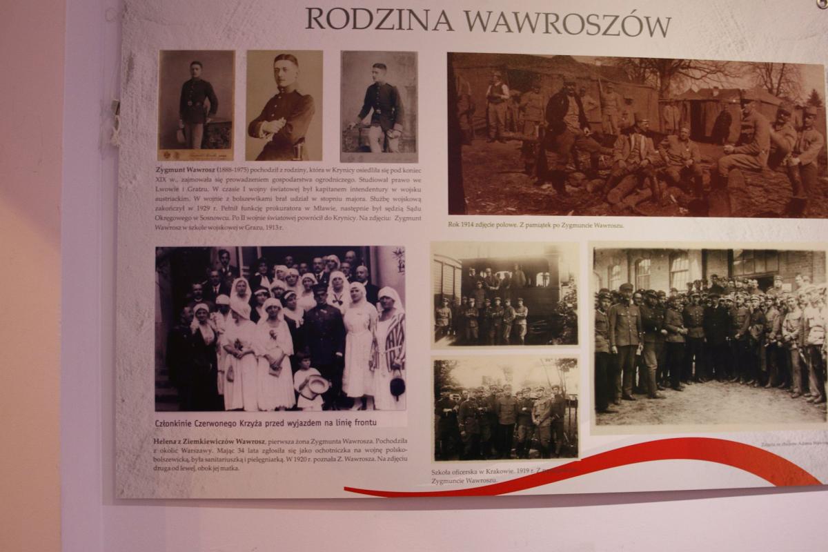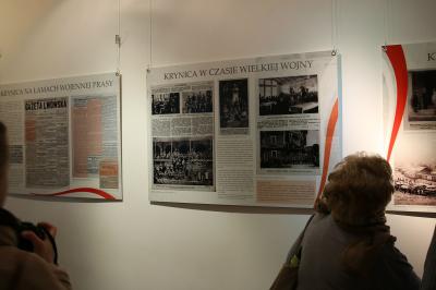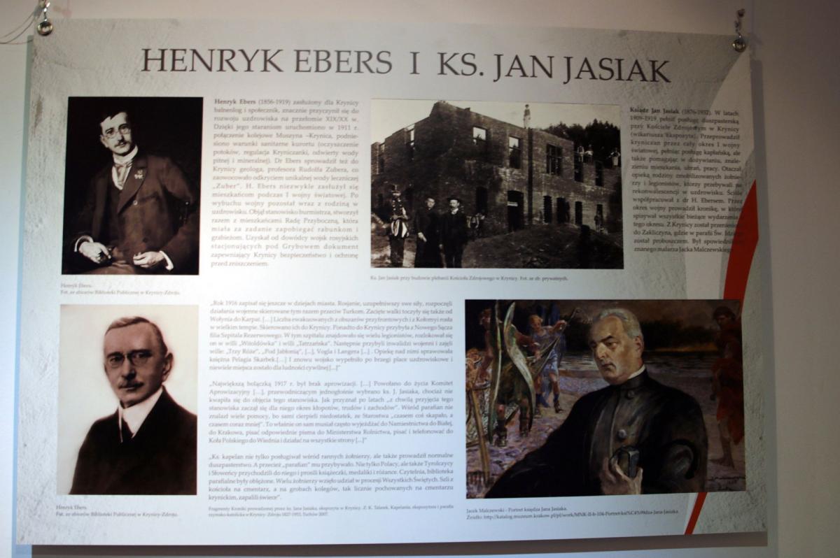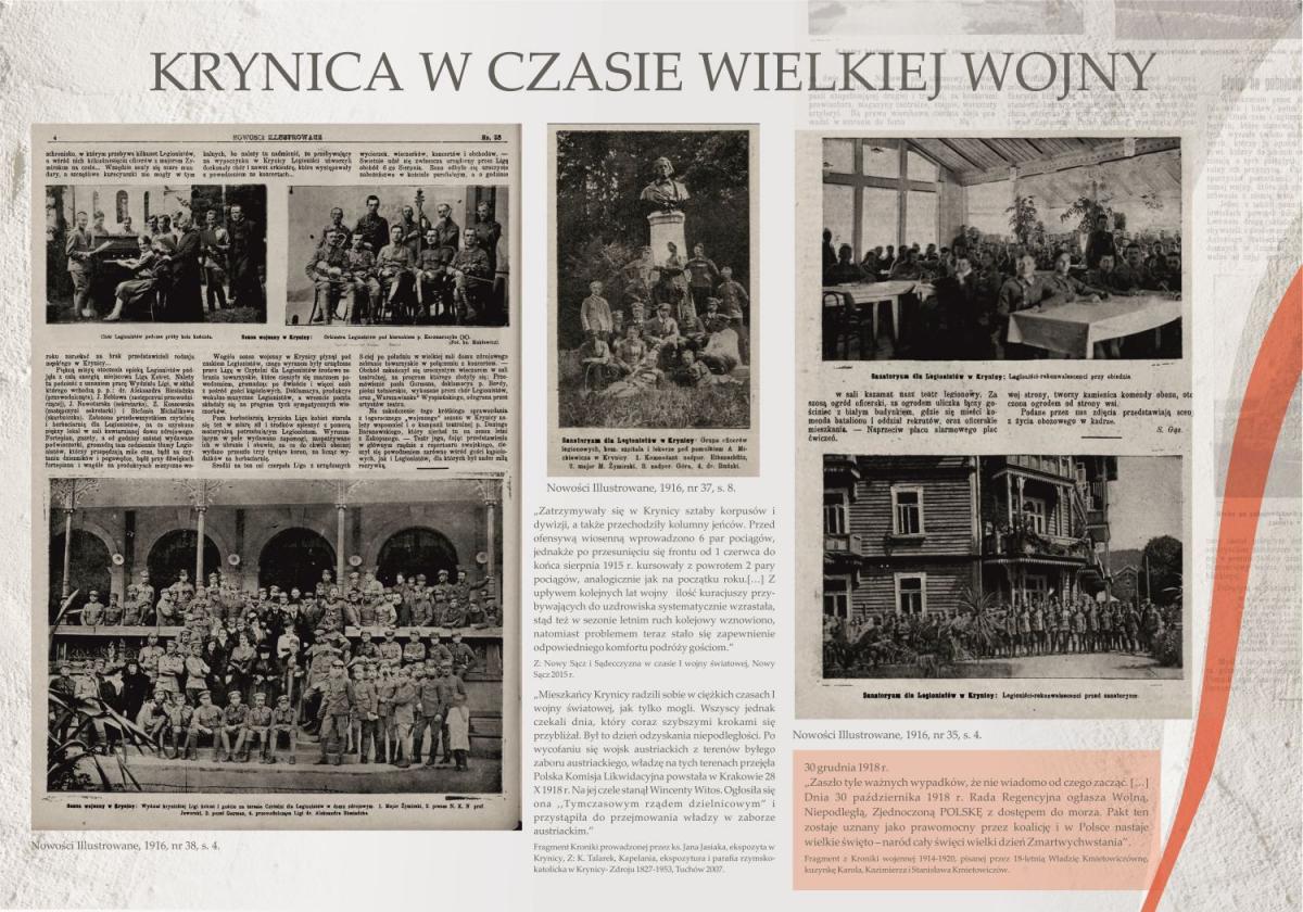 Krynica była odzwierciedleniem narodowego losu, stąd wywodzili się Polacy walczący w różnych armiach i na wielu frontach. Przez uzdrowisko w czasie Wielkiej Wojny przemieszczały się poszczególne wojska (m. in. austriackie, bośniackie, chorwackie, węgierskie, polskie, rosyjskie), uciekinierzy z innych miast i transporty aprowizacyjne. Tutaj lokowano szpitale dla rannych w bitwach żołnierzy. 44 zmarłych pochowano na krynickim cmentarzu wojennym. W krynickich hotelach i pensjonatach wracali do zdrowia legioniści. Mimo wielu trudności (komunikacyjnych i aprowizacyjnych) uzdrowisko niemal przez cały czas było czynne. Mieszkańcy Krynicy przeżywali ciężkie chwile: cierpieli głód, strach, niepewność jutra, zagrożenie zniszczenia miasta. Nastroje wojenne odzwierciedla pisana przez 18-letnią Władysławę Kmietowiczównę, Kronika wojenna 1914-1920, której fragmenty zostały wykorzystane na wystawie. Ciekawym i cennym źródłem wiedzy o wydarzeniach, które miały miejsce w tym czasie w Krynicy jest Kronika prowadzona przez ks. Jana Jasiaka, ekspozyta w Krynicy (cytowana w książce K. Talarka pt. „Kapelania, ekspozytura i parafia rzymsko-katolicka w Krynicy- Zdroju 1827-1953”). Dzięki niej dowiadujemy się o działalności dr Henryka Ebersa, który nie tylko zarządzał uzdrowiskiem w pierwszych dniach wojny, ale także uratował miasto przed zniszczeniem, udając się na interwencję do rosyjskiego generała. Pomoc duchową i materialną krynickiej społeczności, jeńcom, rannym i wracającym do zdrowia żołnierzom niósł ks. Jan Jasiak. W tych ciężkich czasach zasłużył się także dr Franciszek Kmietowicz, naczelnik gminy (potem burmistrz).
