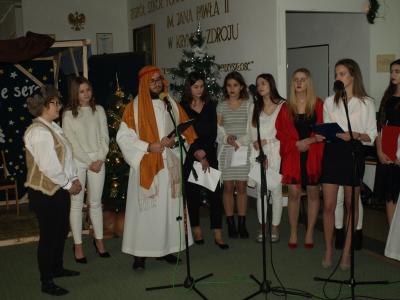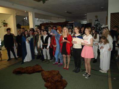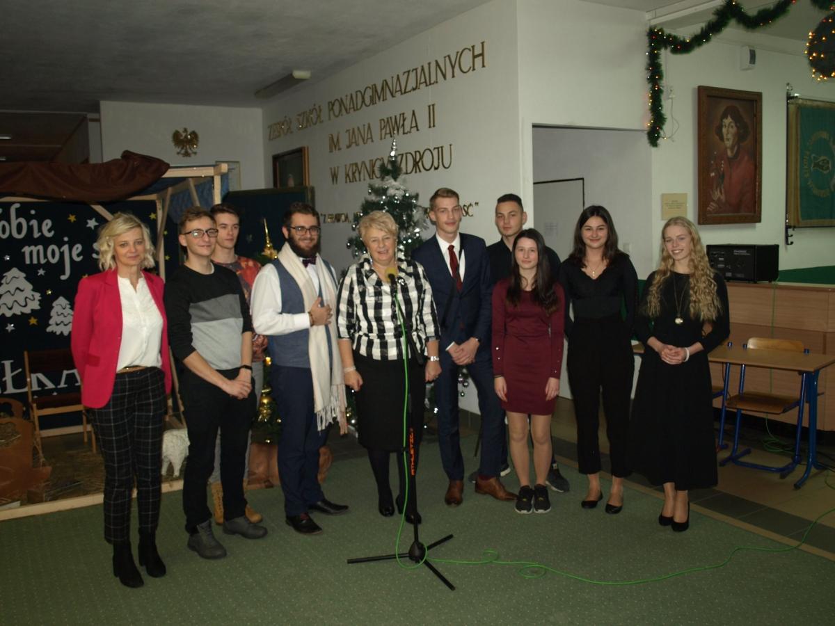 19 grudnia przy wigilijnym stole spotkali się pracownicy i uczniowie ZSP. Na wspólne kolędowanie przybyli również goście: pani Marta Adamczyk-Radna Powiatu Nowosądeckiego, pani Małgorzata Półchłopek-wieloletnia przewodnicząca Rady Miejskiej Krynicy -Zdroju, goście z Lipan z dyrektorem Karolem Tkačem, przewodnicząca Rady Rodziców pani Beata Augustyńska oraz Przewodnicząca Związku Emerytów i Rencistów pani Rozalia Jarząbek. Nie zabrakło również emerytowanych pracowników szkoły na czele z dyrektor szkoły panią Anną Rapacz. Obrzędu poświecenia opłatków dokonali ks. Piotr Cierniak i ks. Proboszcz parafii św. Apostołów Piotra i Pawła w Krynicy-Zdroju Jan Pipka. Przepyszną wieczerzę przygotowali uczniowie z klas gastronomicznych: III TG i II TG pod okiem pani Małgosi Sędzimir i pana Grzegorza Podobińskiego. Cała uroczystość nie mogła by się odbyć, gdyby nie wielki wkład pracy pani Doroty Pacut i jej uczniów z klas III, II i I TH, mistrzów dekoracji stołu, savoir vivru i etykiety. Obecni mieli okazję uczestniczyć w wielkim spektaklu przygotowanym przez młodych artystów ZSP pod kierunkiem księdza Piotra Cierniaka i księdza Pawła Śliwy. Za część oficjalną i przebieg uroczystości odpowiadała opiekun Samorządu Uczniowskiego -pani Magdalena Czyżykiewicz; piękna świąteczna dekoracja to dzieło pani Agnieszki Oleszyckiej.