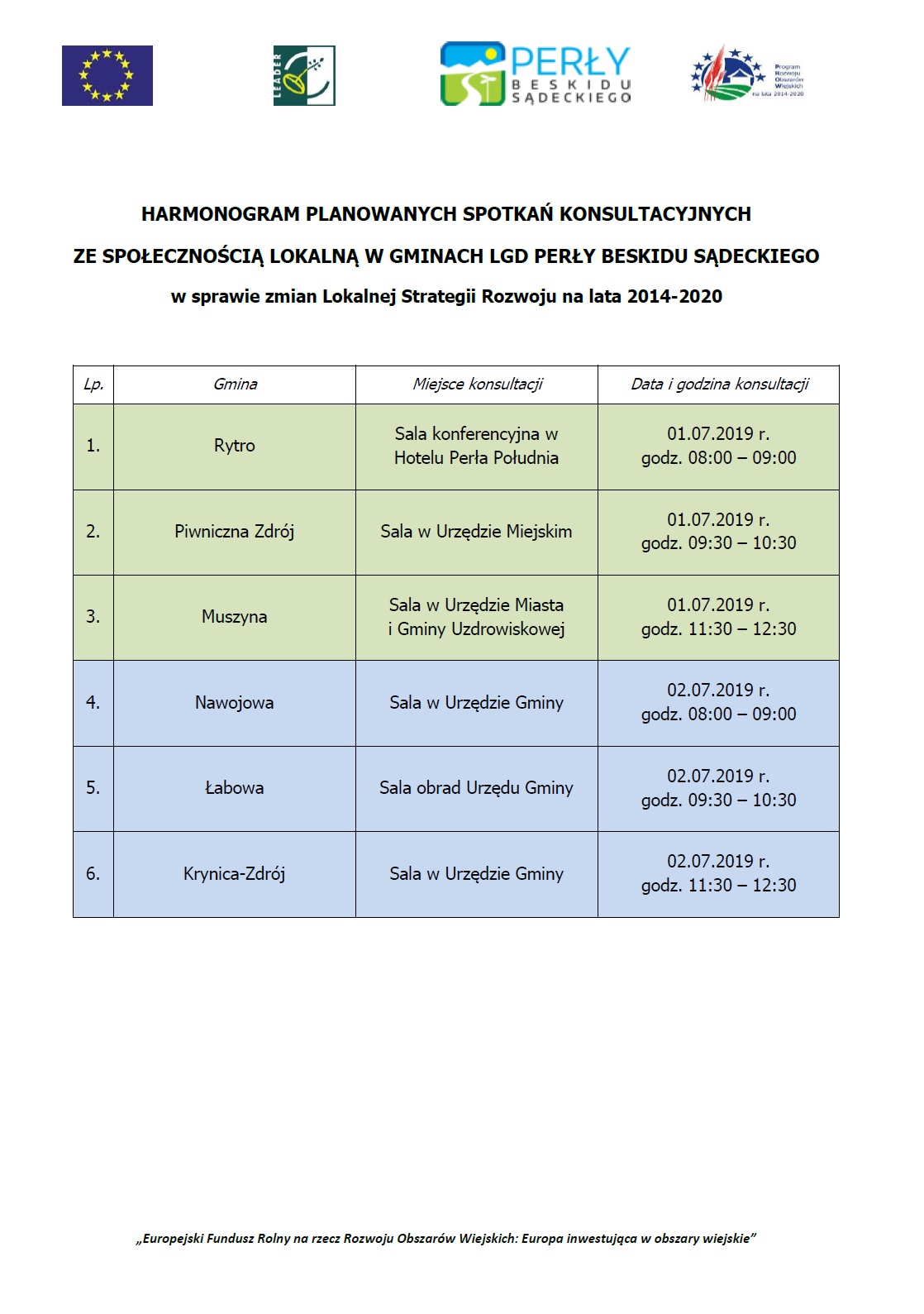 W związku z powyższym serdecznie zapraszamy Gminy, organizacje pozarządowe i zainteresowanych mieszkańców gmin Krynica-Zdrój, Muszyna, Łabowa, Piwniczna-Zdrój i Rytro na spotkania konsultacyjne w sprawie planowanych zmian zgodnie z Harmonogramem spotkań konsultacyjnych w gminach LGD