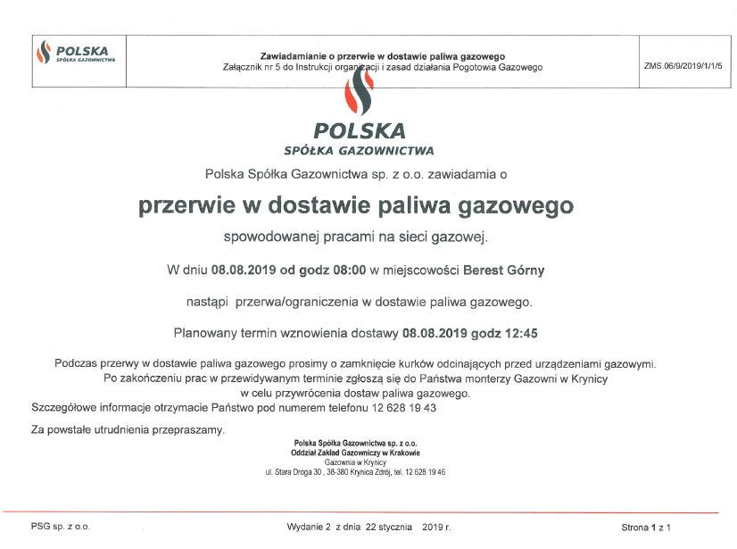 Komunikat o przerwie w dostawie paliwa gazowego w Bereście 02.08.2019 9:19 Treść Facebook Twitter Email Drukuj