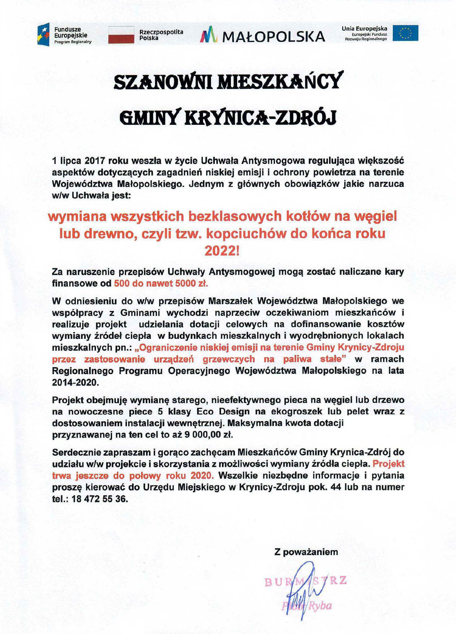 Komunikat Burmistrza Krynicy-Zdroju o obowiązku przestrzegania postanowień Uchwały Antysmogowej oraz możliwościach wymiany źródeł ciepła