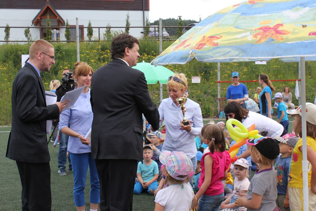 Puchary dla przedszkoli wręczał pan Burmistrz Dariusz Reśko, dyplomy dla uczestników Dyrektor MOSiR Jerzy Szyszka i Dyrektor Centrum Kultury Wojciech Król, upominki sami sponsorzy: Karolina i Mariusz Strokosz, którzy jednocześnie zapewnili obsługę medyczną całej imprezy.
