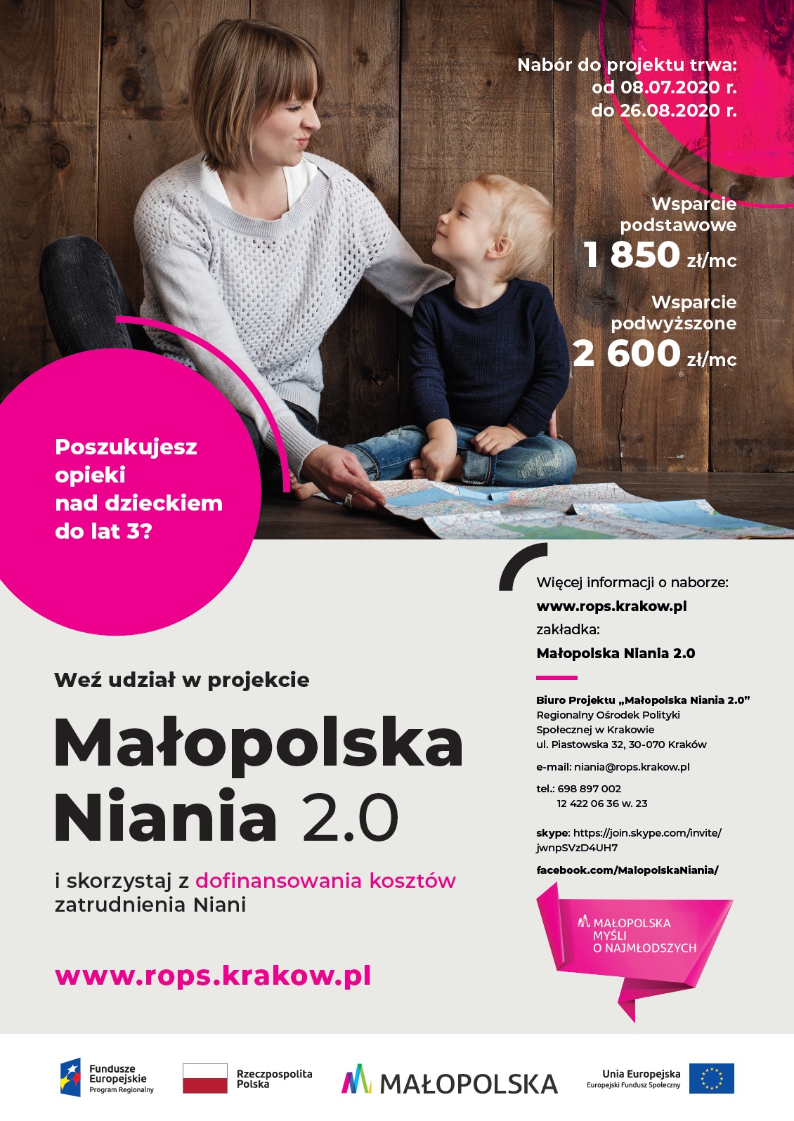 Województwo Małopolskie w odpowiedzi na potrzeby rodziców dzieci w wieku do lat 3 uruchomiło trzeci nabór do Projektu grantowego „Małopolska Niania 2.0” współfinansowanego ze środków Europejskiego Funduszu Społecznego. Ta inicjatywa Województwa Małopolskiego o wartości ponad 19,5 mln zł ma na celu stworzenie warunków do podjęcia lub kontynuacji zatrudnienia przez rodziców dzieci w wieku do lat 3 oraz zwiększenie dostępności do usług opieki nad dziećmi w wieku do lat 3. Realizatorem Projektu jest Regionalny Ośrodek Polityki Społecznej w Krakowie.