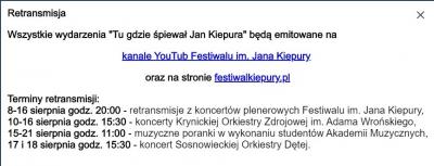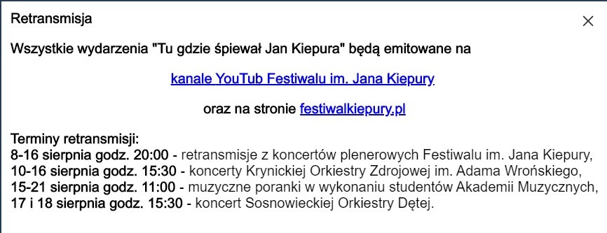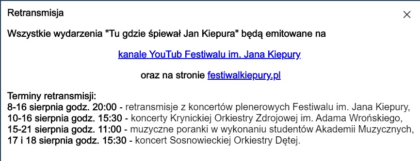 Retransmisje wszystkich wydarzeń "Tu gdzie śpiewał Jan Kiepura" 13.08.2020 10:00 Treść Facebook Twitter Email Drukuj