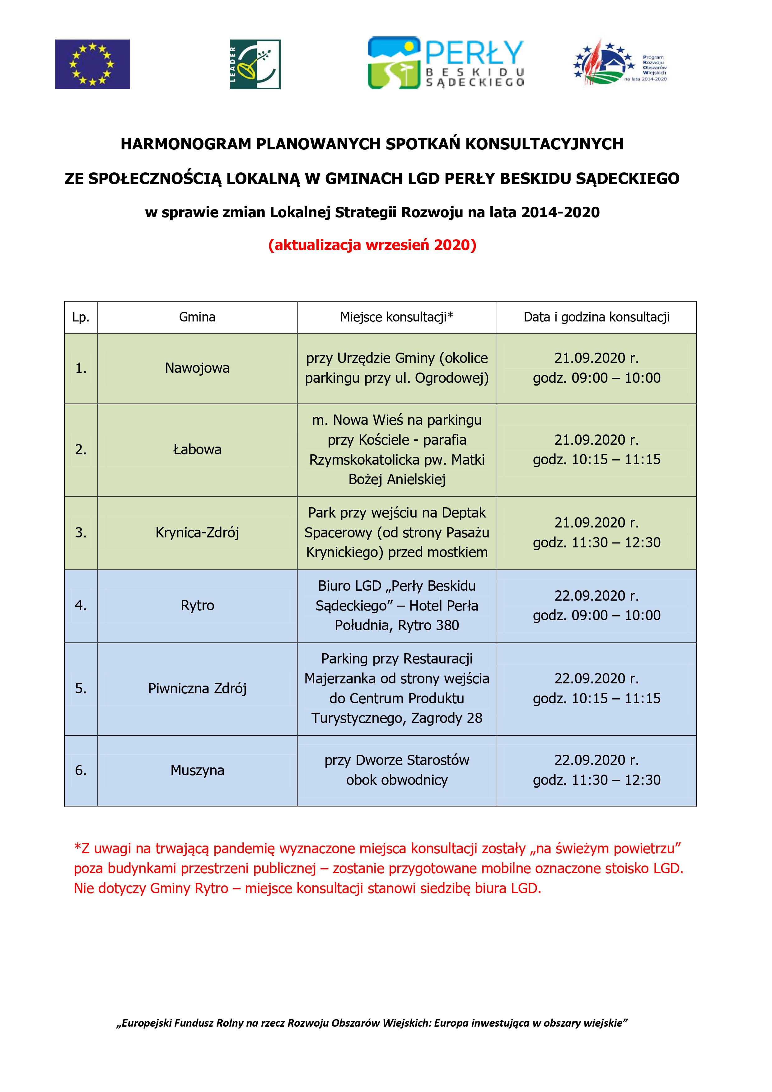 HARMONOGRAM PLANOWANYCH SPOTKAŃ KONSULTACYJNYCH ZE SPOŁECZNOŚCIĄ LOKALNĄ W GMINACH LGD PERŁY BESKIDU SĄDECKIEGO 14.09.2020 11:24 Treść Facebook Twitter Email Drukuj