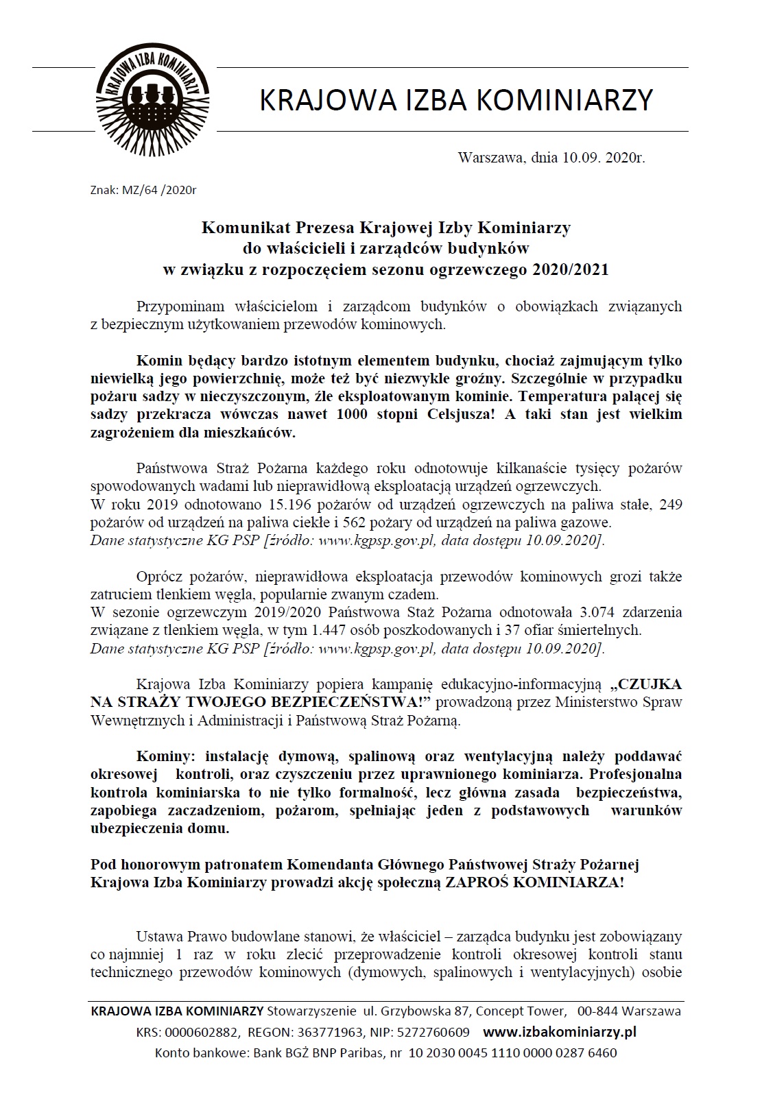 Komunikat Krajowej Izby Kominiarzy dotyczący zbliżającego się sezonu grzewczego 16.09.2020 14:00 Treść Facebook Twitter Email Drukuj