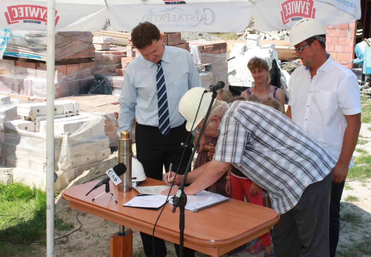 Pod aktem podpisał się Burmistrz Dariusz Reśko, kierownik budowy Ryszard Jarek oraz Łukasz Koczenasz z Fundacji Renovo.
