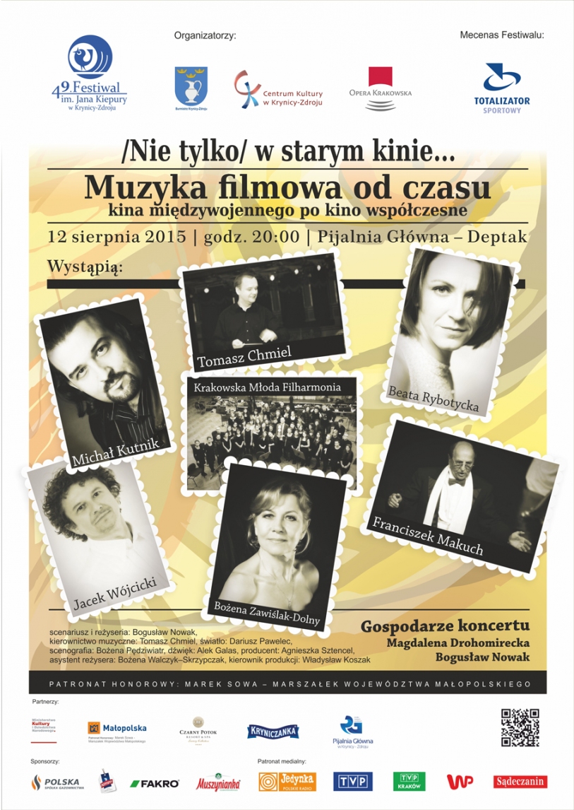 Piosenki z polskich filmów lat międzywojennych należą do wyjątkowo pięknych. Upodobała je sobie publiczność i upodobali wykonawcy. Trudno się dziwić, wszak rodzący się wówczas w Polsce nowy przemysł filmowy przyciągnął najwybitniejszych twórców muzyki, a efekt ich fascynacji podziwiamy do dziś. Miłośnicy piosenek filmowych międzywojnia na pewno będą zadowoleni, bo na program tego wieczoru złożą się takie utwory jak m.in.: „W starym kinie”, „Umówiłem się z nią na dziewiątą”, „Zimny drań”, „Miłość ci wszystko wybaczy” czy „Powróćmy jak za dawnych lat”. A wszystko to w wykonaniu znanych i lubianych artystów: Beaty Rybotyckiej, Bożeny Zawiślak-Dolny, Michała Kutnika, Franciszka Makucha, Jacka Wójcickiego. Jeżeli to tego doda się jeszcze niezwykła energię młodzieżowej orkiestry czyli Krakowskiej Młodej Filharmonii pod dyrekcją Tomasza Chmiela, to już wiadomo, że koncert zapowiada się niezwykle.