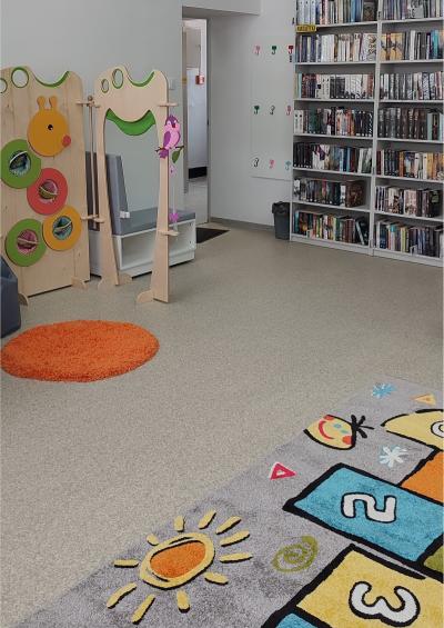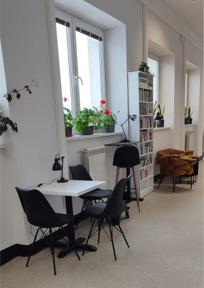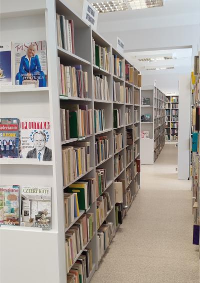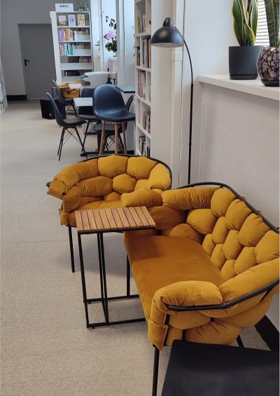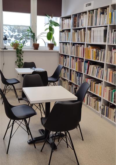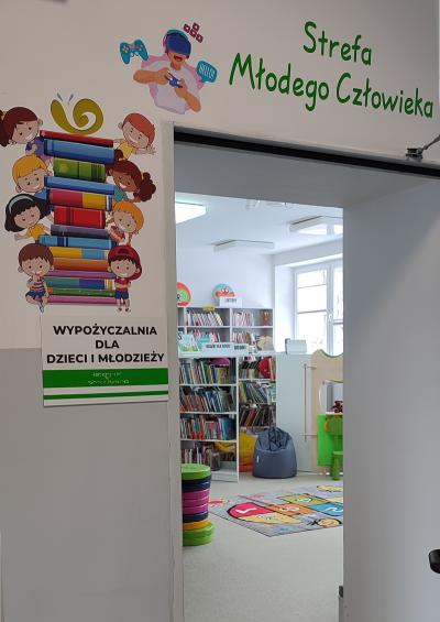 Dzięki wygodnym fotelom i sofom można odpocząć i niespiesznie przejrzeć wybraną literaturę czy poczytać dostępną prasę. Dla osób, które potrzebują spokojnego miejsca do nauki lub pracy zainstalowana zostanie niebawem Strefa Coworking w postaci specjalnego, wyciszonego boksu. Nowością w ofercie biblioteki jest także Strefa Młodego Człowieka - osobne pomieszczenie urządzone dla dzieci i młodzieży. Oprócz książek przeznaczonych dla dzieci w różnych kategoriach wiekowych, najmłodsi czytelnicy mają do dyspozycji gry planszowe i zabawki. Są kolorowe pufy i siedziska oraz drewniany teatrzyk. Natomiast atrakcją dla nieco starszych czytelników jest multimedialna podłoga FunFloor. To interaktywne urządzenie wspomaga edukację i rozwój, ale także zapewnia wesołą zabawę.