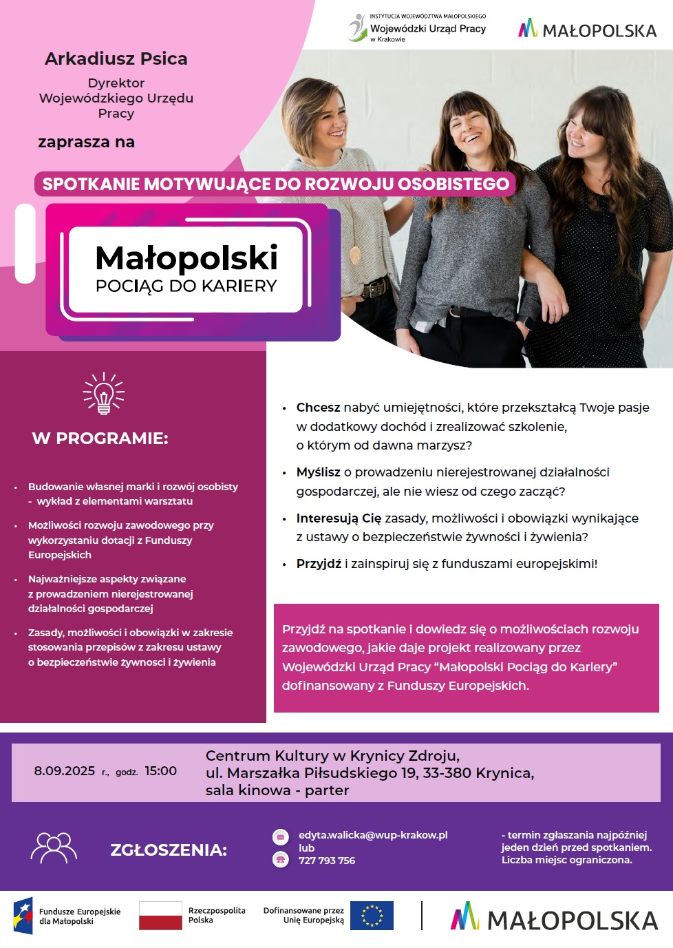 Każda osoba zainteresowana poruszanymi na spotkaniu tematami jest mile widziana, zależy nam także na udziale osób, dla których dedykowane są najbliższe rekrutacje w projekcie Małopolski pociąg do kariery (Kobiety z max. średnim wykształceniem, osoby w wieku 50+ oraz osoby z niepełnosprawnościami) Następne rekrutacje do projektu – Małopolski pociąg do kariery