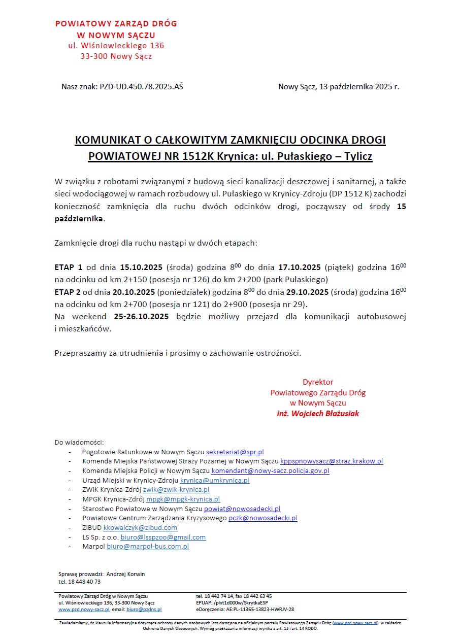 KOMUNIKAT O CAŁKOWITYM ZAMKNIĘCIU ODCINKA DROGI POWIATOWEJ NR 1512K Krynica: ul. Pułaskiego – Tylicz
