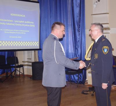 W drugiej części burmistrz Dariusz Reśko pogratulował strażnikom i podziękował za ofiarną pracę na rzecz wspólnoty lokalnej. Strażnicy także otrzymali gratulacje od p. Małgorzaty Półchłopek, przewodniczącej Rady Miejskiej w Krynicy-Zdroju. W imieniu Starosty Nowosądeckiego wyróżnienia wręczył p. Marian Ryba, członek Zarządu Powiatu Nowosądeckiego oraz Ryszard Wąsowicz, kierownik PCZK. Komendant Piotr Szyszka otrzymał „Złote Jabłko Sądeckie”, st. insp. Tadeusz Pasiut oraz insp. Jacek Hojniak otrzymali „Srebrne Jabłko Sądeckie”.