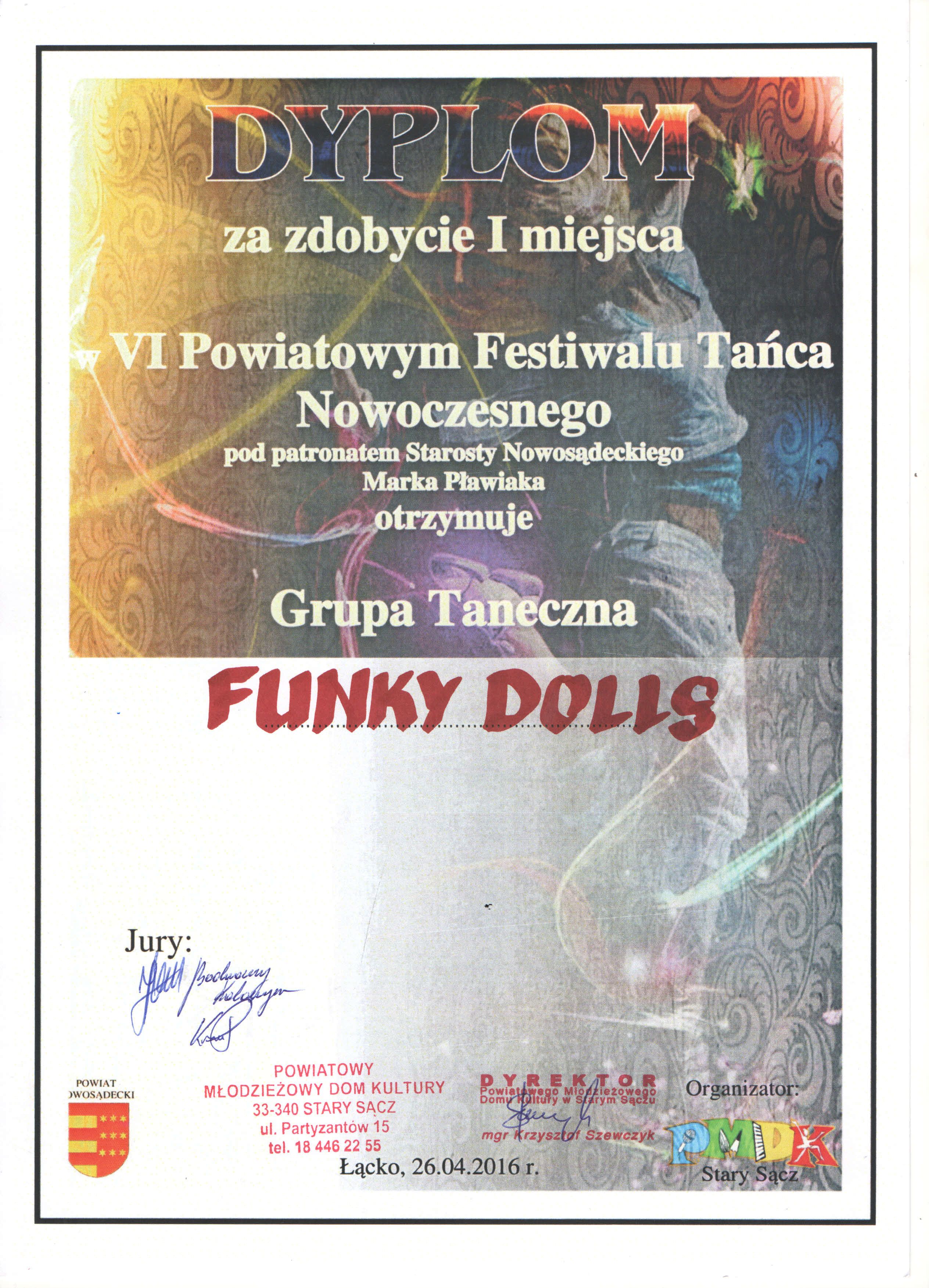 W dniu 26.04.2016 r. Formacja Taneczna „Funky Dolls” działająca przy Miejskim Ośrodku Sportu i Rekreacji w Krynicy-Zdroju zdobyła I miejsce na VI Powiatowym Festiwalu Tańca Nowoczesnego w Łącku. Konkurs zorganizowany został przez Młodzieżowy Dom Kultury w Starym Sączu pod patronatem Starosty Nowosądeckiego Marka Płaciaka. W VI Powiatowym Festiwalu Tańca Nowoczesnego w Łącku wzięło udział ponad czterdzieści zespołów tanecznych. „Funky Dolls” startowały w kategorii wiekowej B (od 11-14 lat)