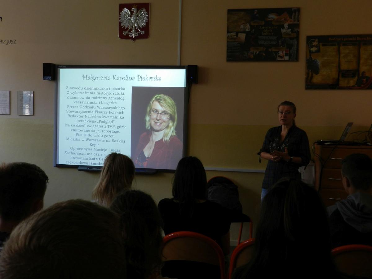 W Publicznym Gimnazjum im. prof. dra w Krynicy-Zdroju odbyło się spotkanie autorskie ze znaną pisarką, dziennikarką radiową i telewizyjną Małgorzatą Karoliną Piekarską. Autorka takich powieści młodzieżowych jak „Klasa pani Czajki”, ”Loteria” czy „Tropiciele” zapoznała gimnazjalistów ze swoją twórczością literacką i opowiedziała o początkach swojej pisarskiej kariery. Za pośrednictwem prezentacji multimedialnej przeniosła młodych czytelników w świat swoich książek, których tematyka często zaczerpnięta jest z życia osobistego i rodzinnego autorki.