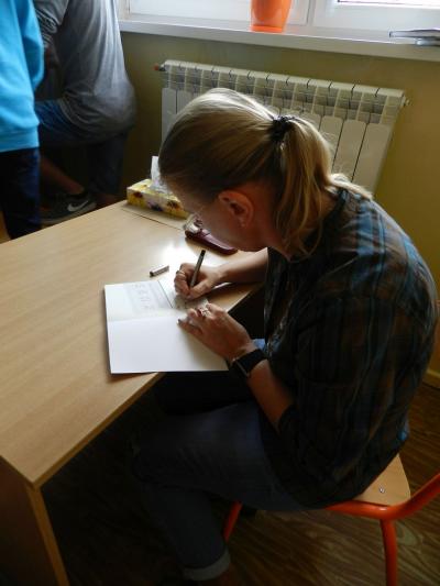 Spotkanie literackie, z zadowoleniem przyjęte przez gimnazjalistów, zakończyło się otrzymaniem autografów z osobistą dedykacją miłego gościa. Uczniowie, wdzięczni za tak twórczo spędzony czas, wręczyli pisarce symboliczny bukiet goździków. Uwieńczeniem literackiego przedpołudnia stała się wspólna fotografia.